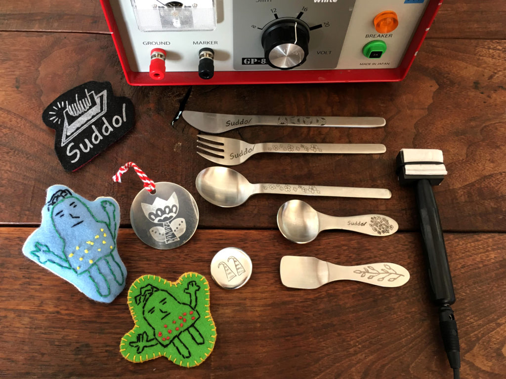 シルクスクリーンで遊べるお店Suddo/(すっど)です。金属に印刷ができる”電解マーキング”を使ってカトラリーや缶バッジを作ろう!”